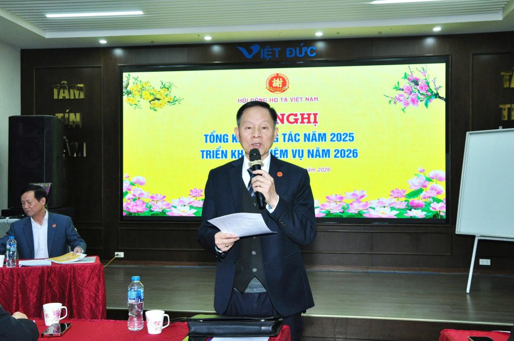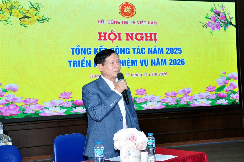 Tại Hội nghị, ông Tạ Duy Bình – Phó Chủ tịch Thường trực Hội đồng họ Tạ Việt Nam đã trình bày Báo cáo tổng kết công tác năm 2025 và phương hướng, nhiệm vụ năm 2026. Báo cáo đã đánh giá khách quan, toàn diện kết quả thực hiện Nghị quyết Đại hội IV (nhiệm kỳ 2023–2028), phản ánh sinh động các hoạt động của Hội đồng họ Tạ các cấp trên cả nước, từ công tác tổ chức, kết nối chi tộc, tri ân tiền nhân đến truyền thông, nghiên cứu lịch sử – phả hệ và quản lý tài chính.