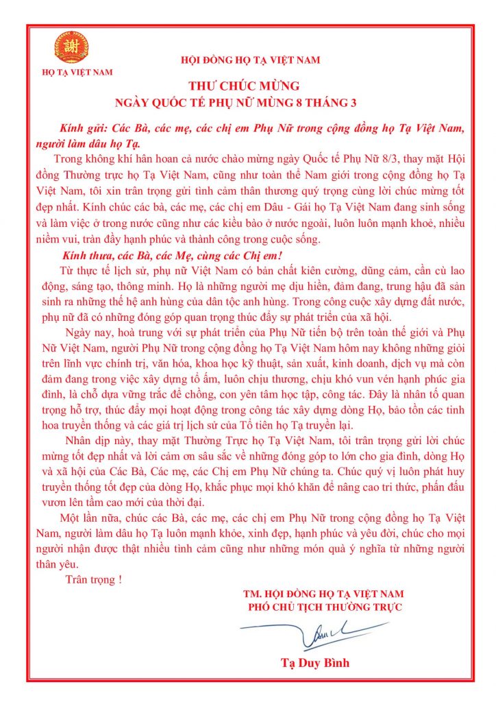 Kính gửi: Các bà, các mẹ, các chị em dâu – gái trong cộng đồng Họ Tạ. Nhân dịp Ngày Quốc tế Phụ nữ 8/3, thay mặt Hội đồng Họ Tạ thành phố Hà Nội, tôi xin gửi tới toàn thể các bà, các mẹ, các chị em dâu – gái trong cộng đồng Họ […]