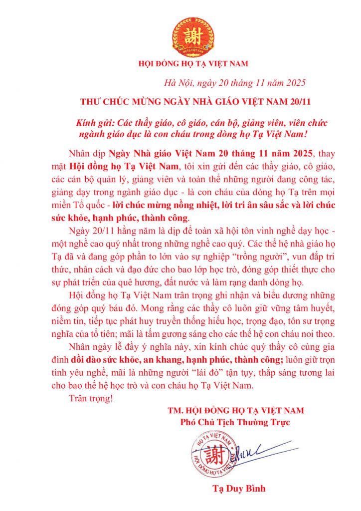 Nhân dịp Ngày Nhà giáo Việt Nam 20 tháng 11 năm 2025, thay mặt Hội đồng họ Tạ Việt Nam, tôi xin gửi đến các thầy giáo, cô giáo, các cán bộ quản lý, giảng viên và toàn thể những người đang công tác, giảng dạy trong ngành giáo dục – là con cháu của dòng họ Tạ trên mọi miền Tổ quốc – lời chúc mừng nồng nhiệt, lời tri ân sâu sắc và lời chúc sức khỏe, hạnh phúc, thành công.