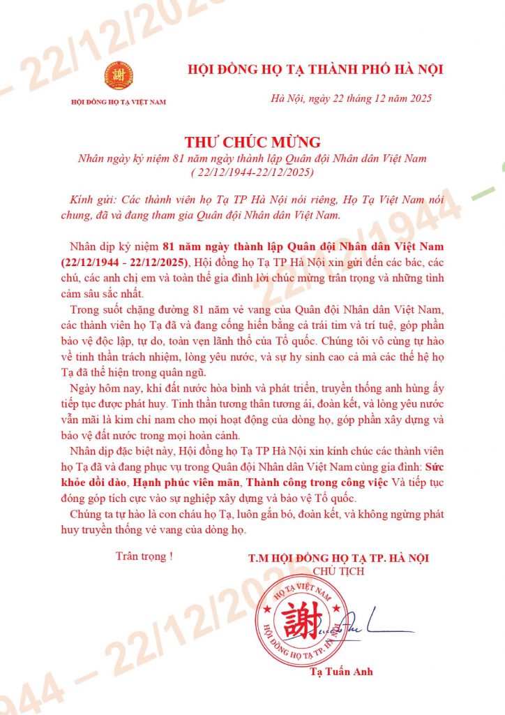 Kính gửi: Các bà, các mẹ, các chị em – là con dâu, con gái trong Cộng đồng Họ Tạ TP Hà Nội. Nhân kỷ niệm 95 năm Ngày Phụ nữ Việt Nam (20/10/1930 – 20/10/2025), thay mặt Hội đồng Họ Tạ TP Hà Nội, tôi trân trọng gửi tới toàn thể các bà, […]